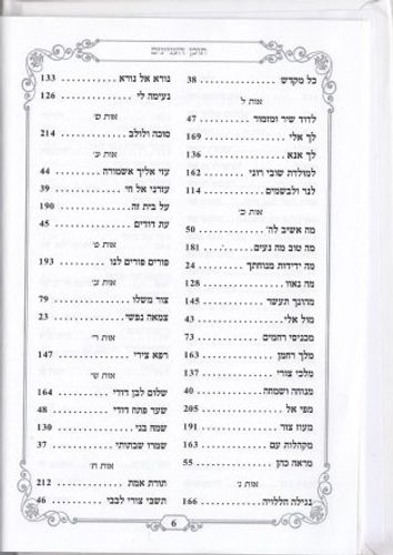 אל אליהו, אל גליל, אל חובי, אל מאוד נעלה, אלי אלי, אלי יה אלי, אליך אקרא יה, אם חכם ליבך בני, אם ננעלו, אמר ה’ ליעקב, אנא בחסדך, אנא יה חביבי, אנוש נוצר, אני אליך, אעופה אשכונה, אערוך מהלל ניבי לאל, אערוך לפני, אשאל אלוקי, אשיר לאל, אתה אהובי, אתה אל כביר, במוצאי יום מנוחה, בר יוחאי, ברוך אל עליון,ברוכים אתם, בשעה שמלך המשיח בא, בתי צאי, גואל יבוא, גואלי יה, דרור יקרא, דווי הסר, דע לך, החליפי, הלילה,הללויה, המבדיל, ואמרתם כה לחי, ותזכני, זה אלי וגואלי, חביבי יה חביבי, חוקותיה במרה, חי ה’ וברוך צורי, חיש חיש, חכמה בינה יה אלי, חן הבה, ידיד נפש, ידידי השכחת, ידידי רועי, יה אכסוף, יה ריבון עלם, יה רופאי, יה רצני, יהי החודש הזה,