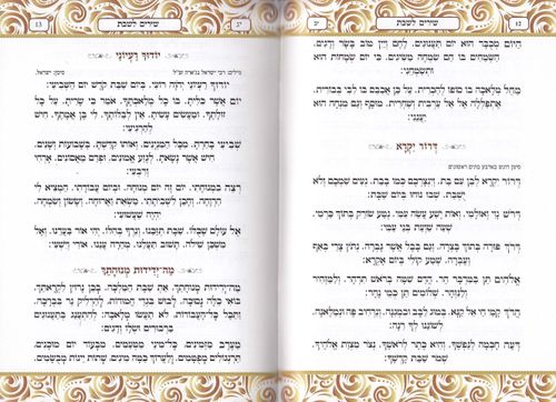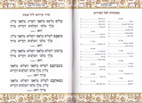 שלום עליכם, אשת חיל, בר יוחאי, כי אשמרה שבת, דרור יקרא, יודוך רעיוני, מה ידידות, יום זה לישראל, יום השבת אין כמוהו, אליך אקרא יה, יום זה מכובד, ברוך אל עליון, צמאה נפשי, ידי נפש, אגדלך, אודה לאל לבב חוקר, יום שבתון, יה ריבון עלם, אשיר לאל, כל מקדש שביעי, חי ה’ וברוך צורי, מנוחה ושמחה, יה אכסוף, מול אלי וגדלו, עת ודים כלה, יודוך לך רעיוני, אעופה אשכונה, יםה ותמה, תוכו רצוף אהבה, הלב שלי,