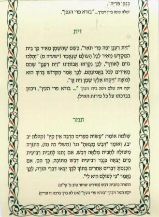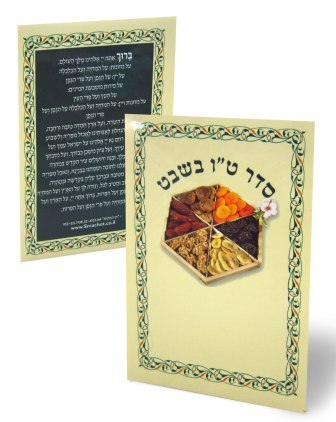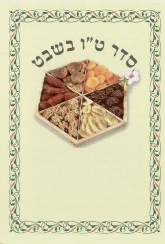 Tu b’Shevat Seder includes traditional Tu b’Shevat seder with all seven species, legends and Blessings for After Snacks. Size 34×8 cm. Three fold (8 × 12 when folded)