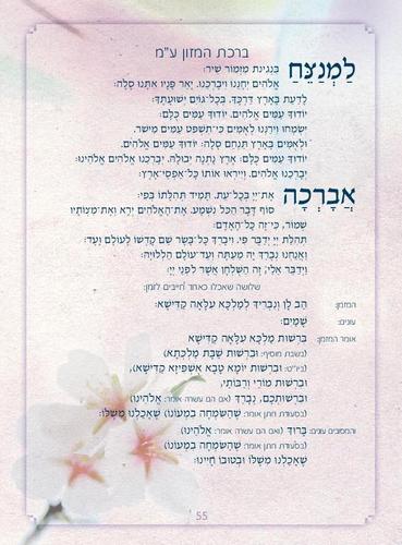 Beautiful Shabbat Song Book. Designed with almond blossoms. Innovative and distinctive. 64 pages. Includes Kiddush for Shabbat and festivals, Shabbat songs, Grace After Meals in two nusachim, and Havdalah. 12cm wide x 17 cm length